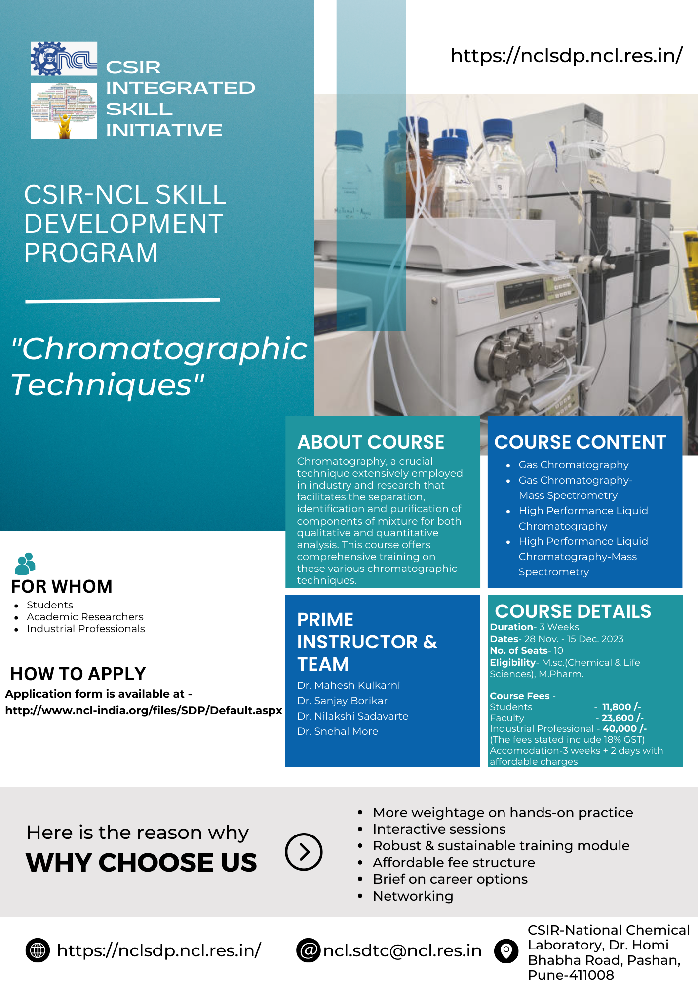 Chromatography, a crucial technique extensively employed in industry and research that facilitates the separation, identification and purification of components of mixture for both qualitative and quantitative analysis. This course offers comprehensive training on these various chromatographic techniques. Course Content_ 1. Gas Chromatography 2. Gas Chromatography-Mass Spectrometry 3. High Performance Liquid Chromatography 4. High Performance Liquid Chromatography-Mass Spectrometry